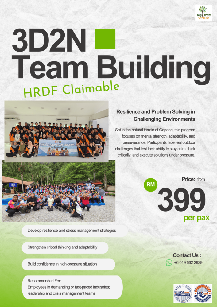 Yes. Gopeng Adventure Specialist is a certified HRD Corp training provider, and most of our corporate training and team building programs are fully HRDF-claimable under the “Training” category.